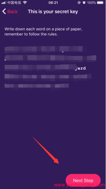 5、确认你的秘钥,对照上一步,选择正确的单词。