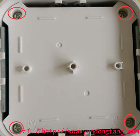 迅雷赚钱宝拿到手上,有不少的朋友就想拆开看看这货到底是什么玩意?拆解的方法是比较简单的,把赚钱宝屁股后面的二维码撕开然后就会看到如下图所示的一个颗螺丝。把它拧掉。