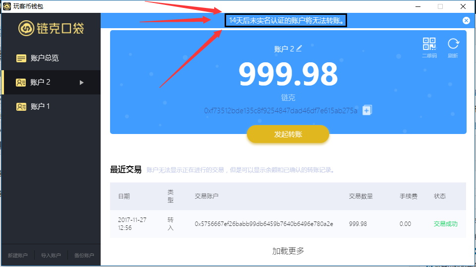 链克钱包提示的是:14天后未实名认证的账户将无法转账