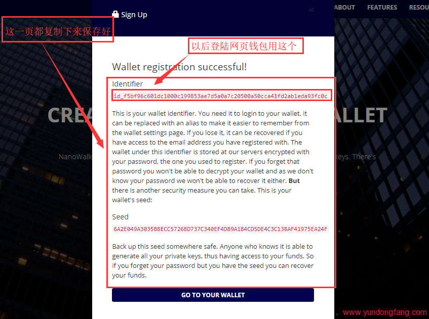 注意下面这一图。注册成功后一定要把这里的信息都复制下来。同时要注意看图片上的文字。最后点击【Go TO YOUR WALLERT】这样就注册成功了。